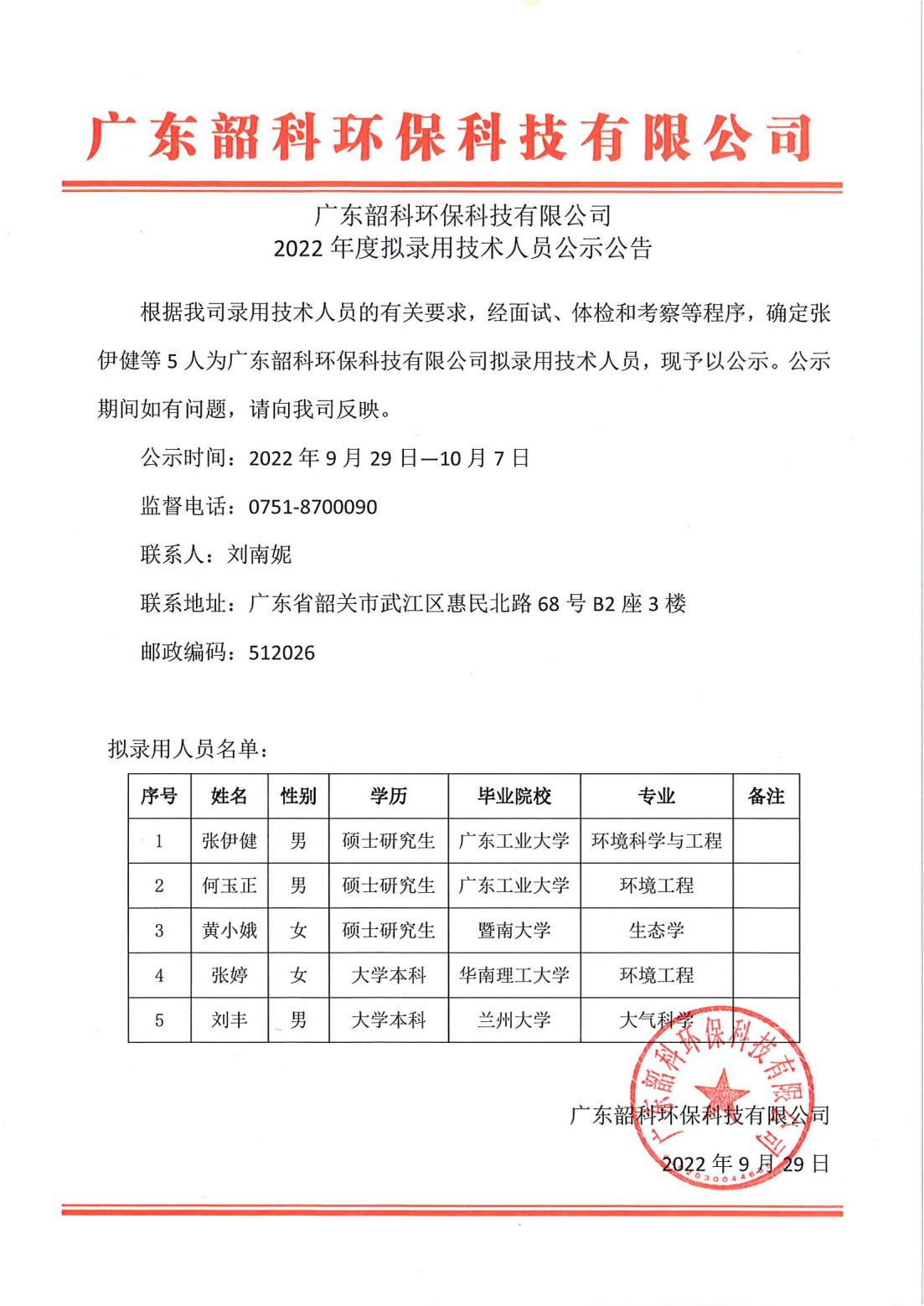根据我司录用技术人员的有关要求,经面试、体检和考察等程序,确定张伊健等5人为广东韶科环保科技有限公司拟录用技术人员,现予以公示。公示期间如有问题,请向我司反映。
