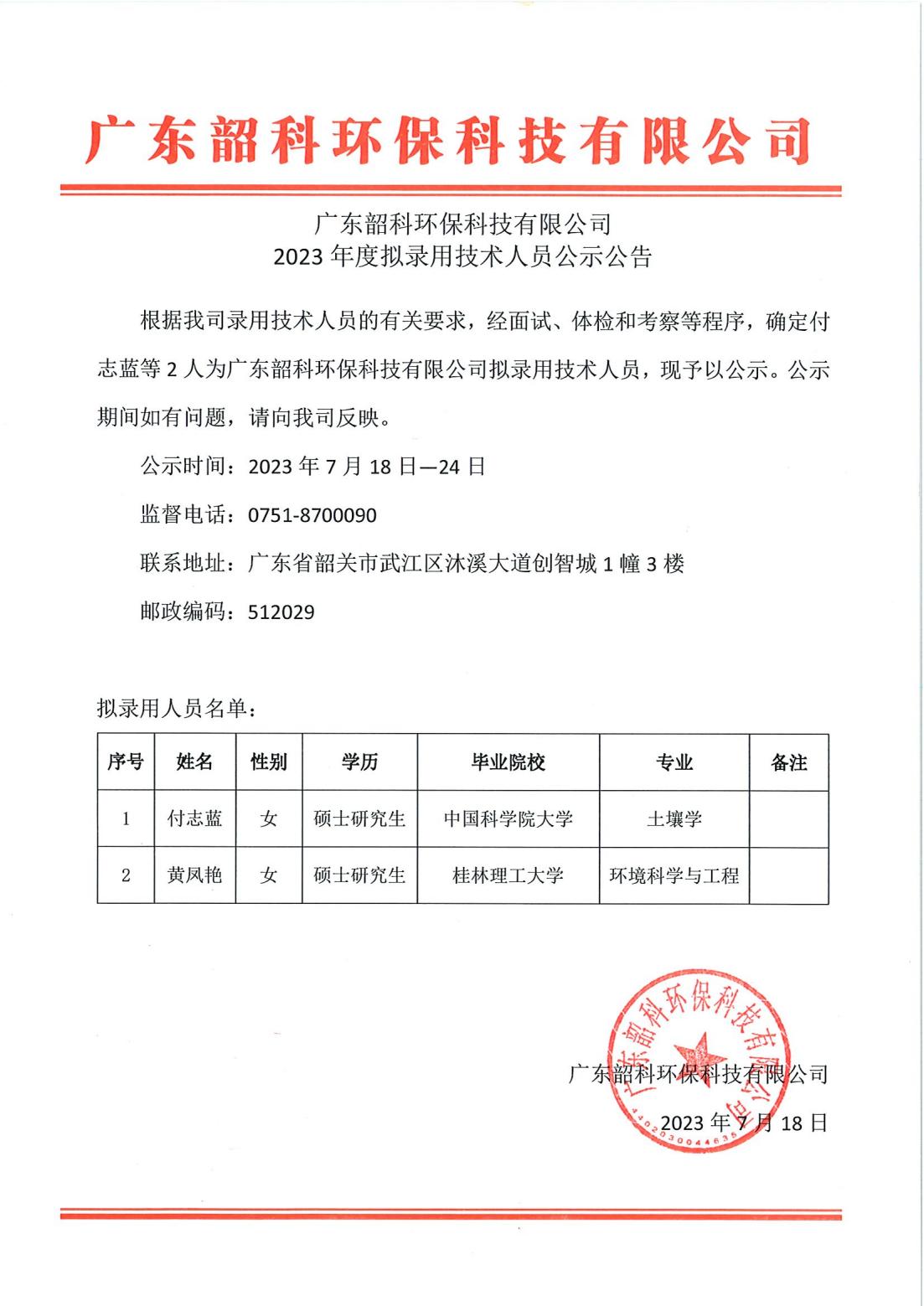 根据我司录用技术人员的有关要求,经面试、体检和考察等程序,确定付志蓝等2人为广东韶科环保科技有限公司拟录用技术人员,现予以公示。公示期间如有问题,请向我司反映。