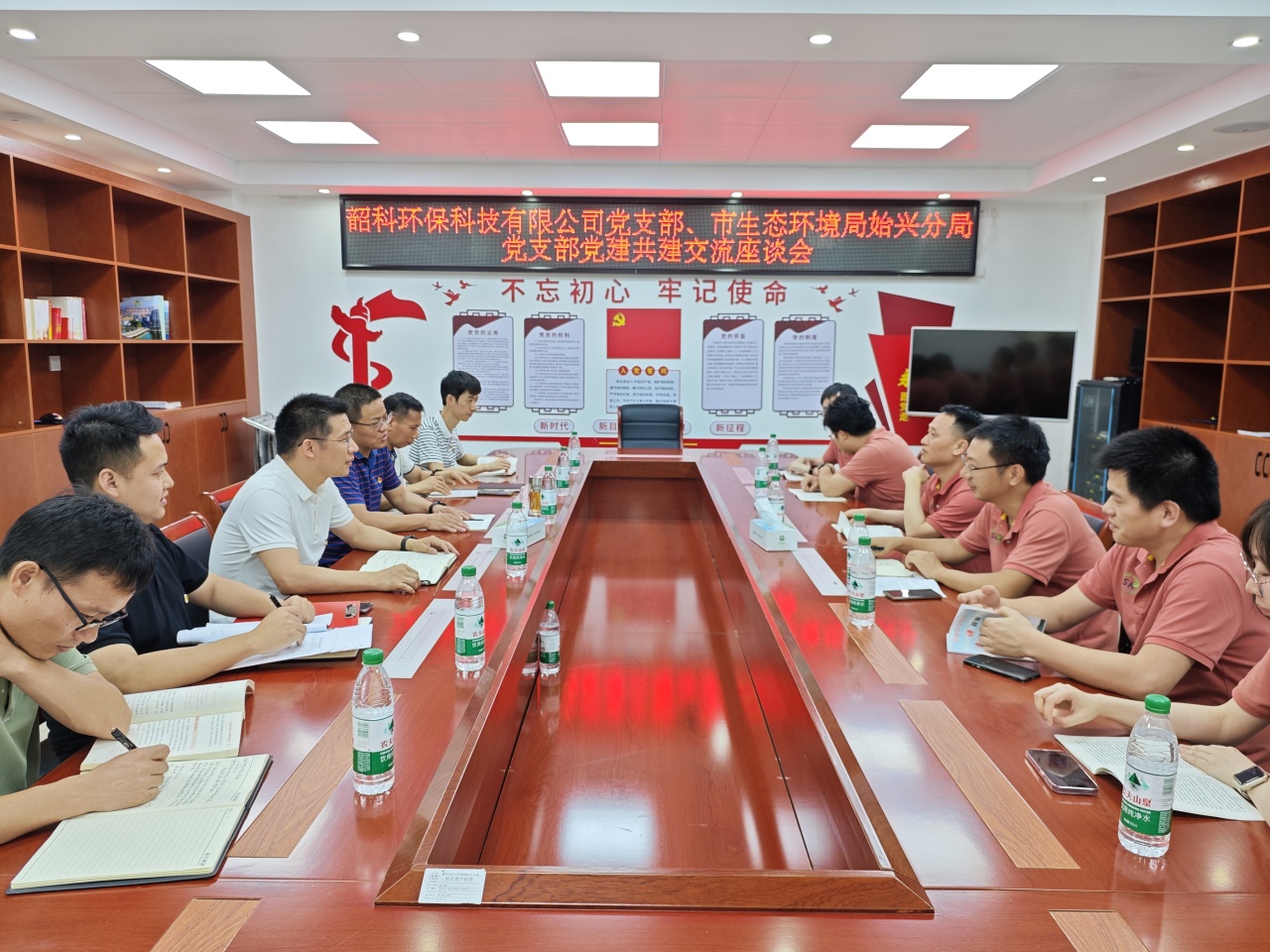 抵达市生态环境局始兴分局后,分局党支部负责人首先带领我们参观了红色文化长廊并详细介绍了分局的阵地建设,让我们深刻地感受到他们在党建工作上付出的心血并积累了阵地建设经验。在党建共建交流会上,大家对如何开展好党纪学习教育工作进行了交流探讨,就农村生活污水治理、生态文明建设等业务进行了深入的讨论研究,我司党员积极建言献策。大家纷纷表示要立足岗位,用自己的实际行动保护环境,让蓝天白云成为常态,让绿水青山随处可见。
